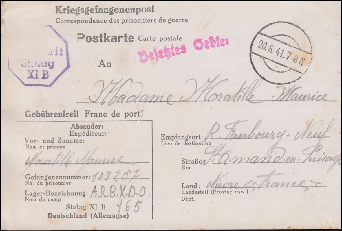 Poste de prisonniers de guerre Stalag XI B, timbre-cadran 20.6.1941 vers la France