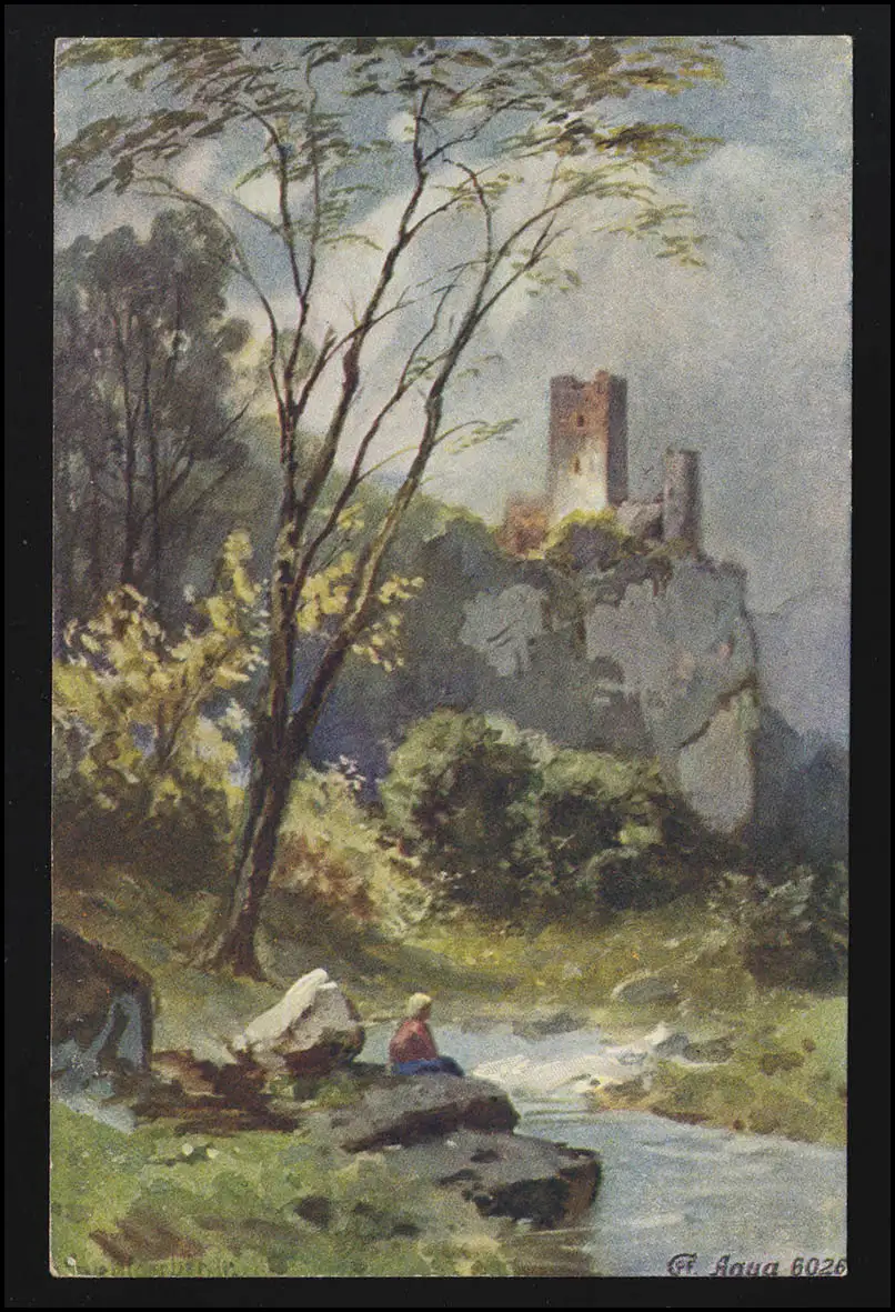 Artiste AK Aquarell Jeune sur la rivière sous le château ruine, signé, non utilisé