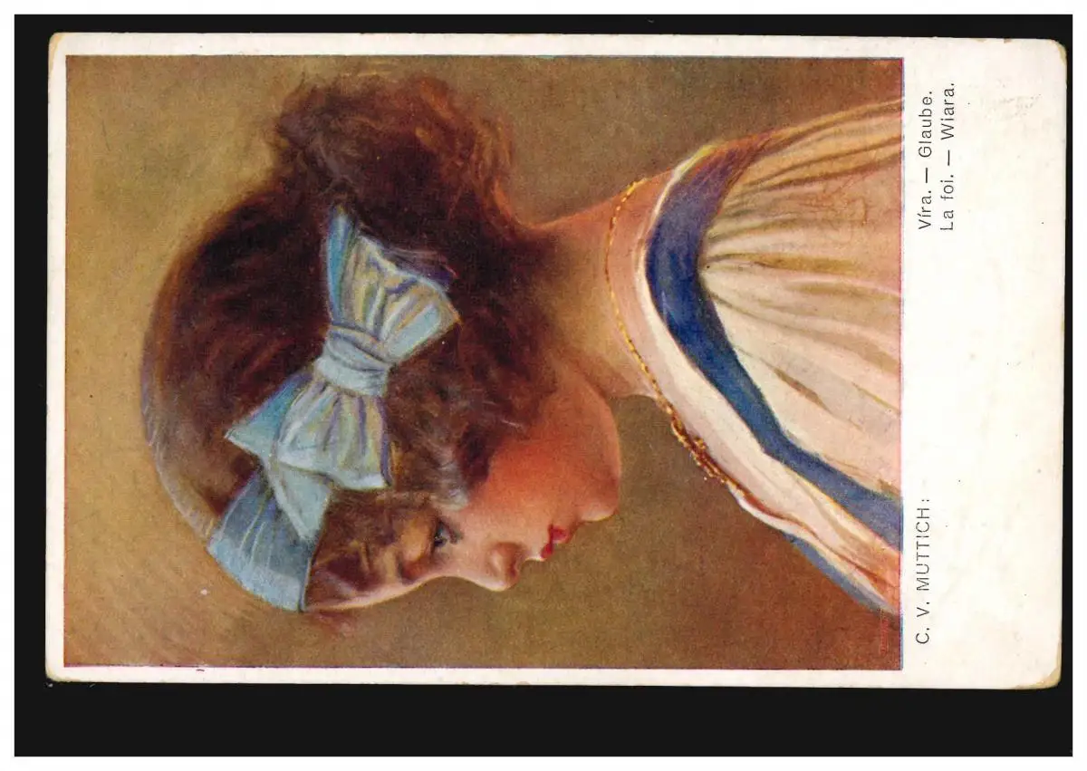 AK Artiste C.V. Muttich: Foi - Portrait de fille avec boucle de cheveux bleu, 1916