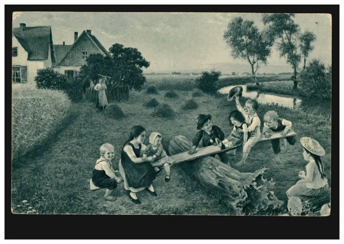 AK Artiste Claus de Bergen Peinture La balançoire, Maison d'Oberstoff 18.7.1915