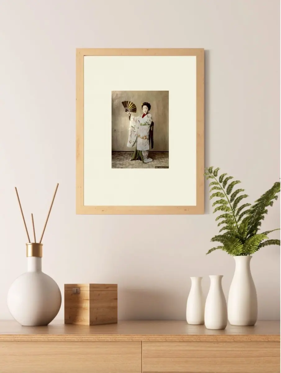 Kusakabe Kimbei photographie en studio et met en scène une vision très pittoresque de la culture nippone en faisant figurer cette danseuse de Kyoto vêtue de kimono, évantail de papier à la main.