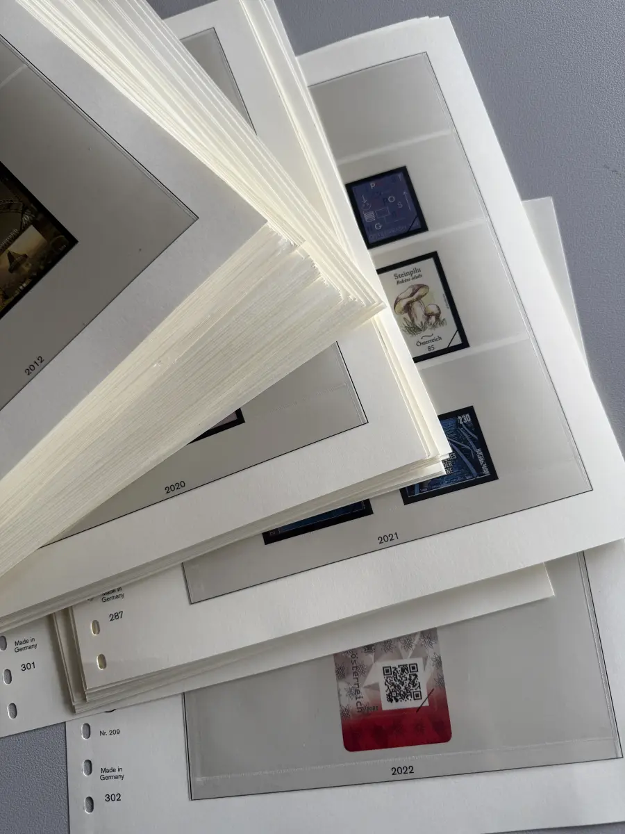 Mit Deckblatt, in Farbe. Auf den Vordruckblättern befinden sich vom Hersteller werkseitig angebrachte Einsteckfolien. Sauber gebrauchte Erhaltung aus Sammler-Nachlass. Die geschätzt ca. 200 Vordruckblätter sind augenscheinlich weitgehend komplett - es sind auch einige Sonderblätter für Kleinbogen, Schwarzdrucke etc. enthalten. Die passenden gebrauchten Ringbinder von Lindner haben wir übrigens hier auch im Angebot.