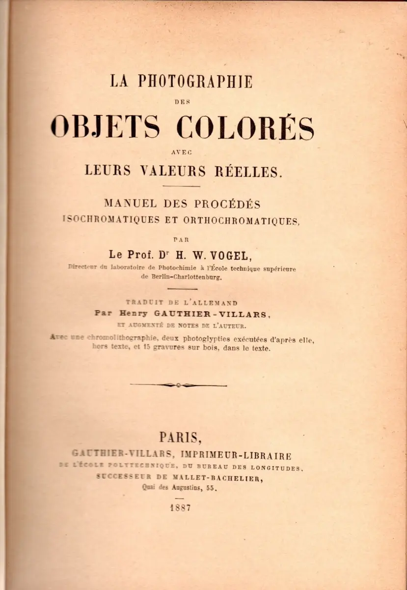 VOGEL (H.W). LA PHOTOGRAPHIE DES OBJETS COLORES avec leur valeur réelle. Paris, Gauthier-Villars 1887