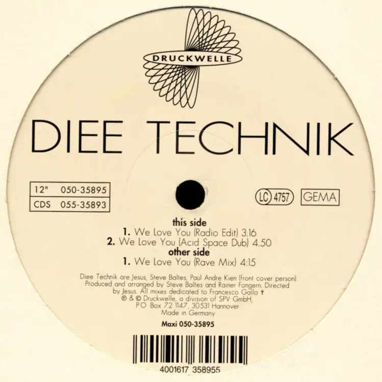 12" Maxi Diee Technik - We Love You, Cover neutre, État Platte VG+; Fabriqué en Allemagne 1995 onde de pression SPV 055-35895, Tracks [Rave Mix] 4:50, [radio Edit] 3:20, (Acid Space Dub) 4:45