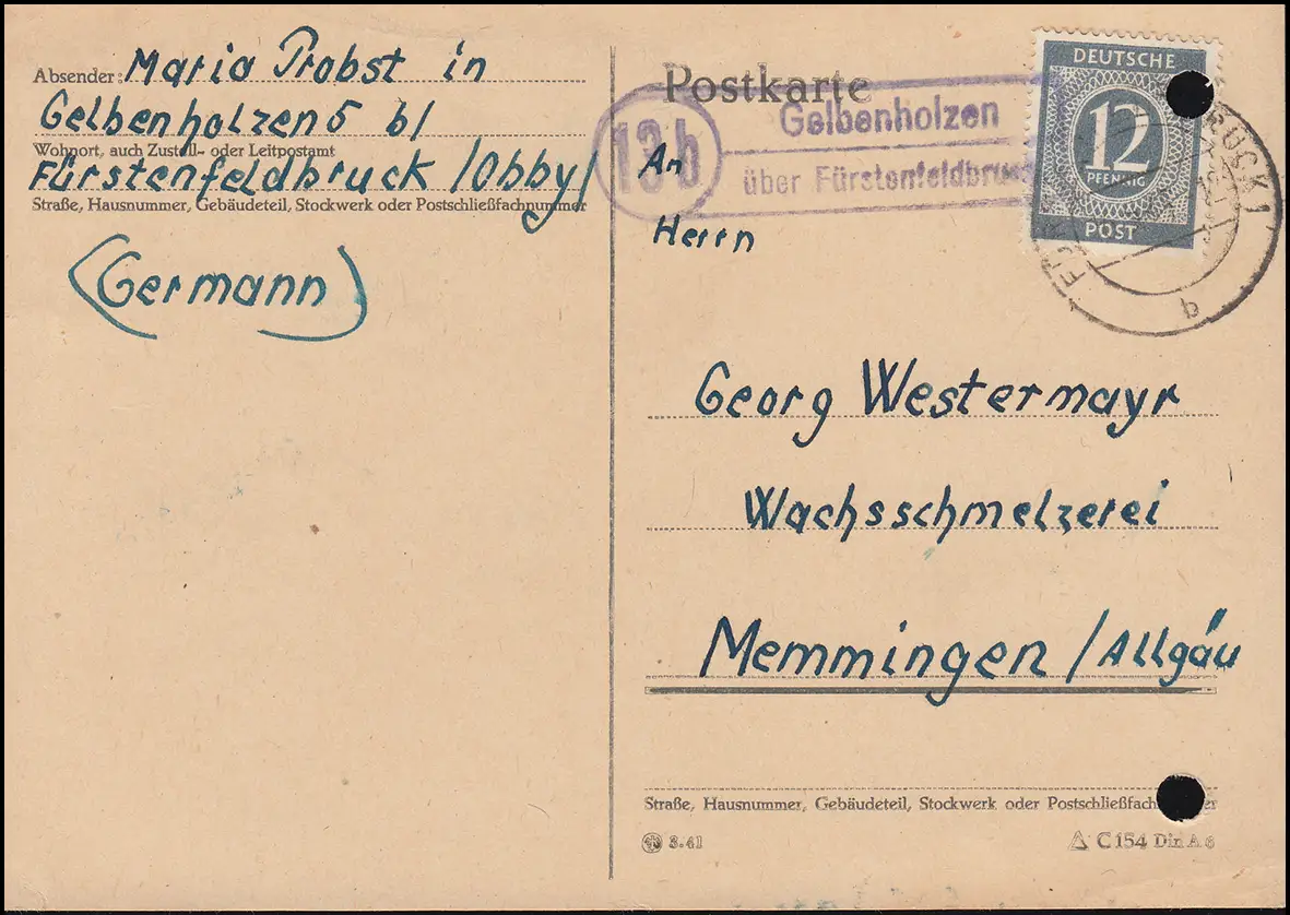 Payspost 13b Bois jaunes sur FÜNSTENFELDBRUCK 16.5.47, carte postale EF 12 Pf
