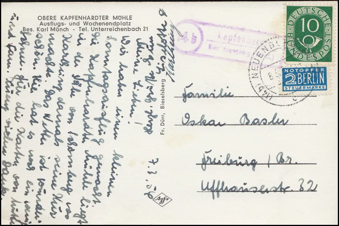 Landpost 14b Kapfenhardt sur LES NOUVELLES BUREAUX (WURTT) 8.3.1954 sur AK appropriée