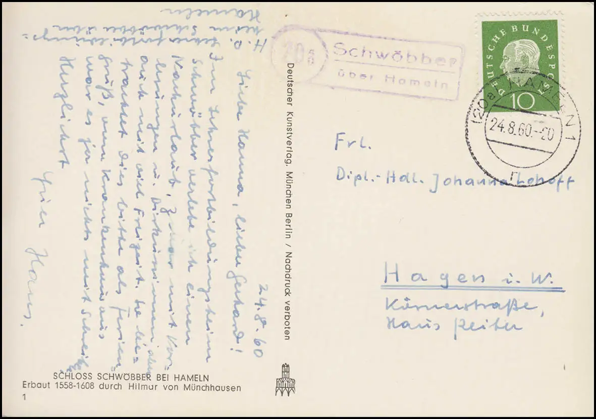 Landpost 20a SCHWÖBBER sur HAMELN 24.8.60 sur AK Château de ceux de Münchhausen