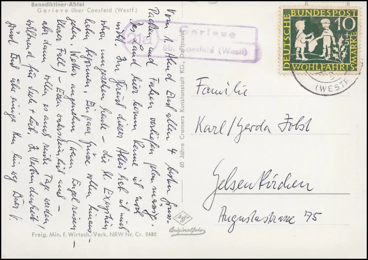 Le courrier de campagne 21a Gerleve sur COESFELD (WESTFALEN) 1959 sur AK Abbaye bénédictine