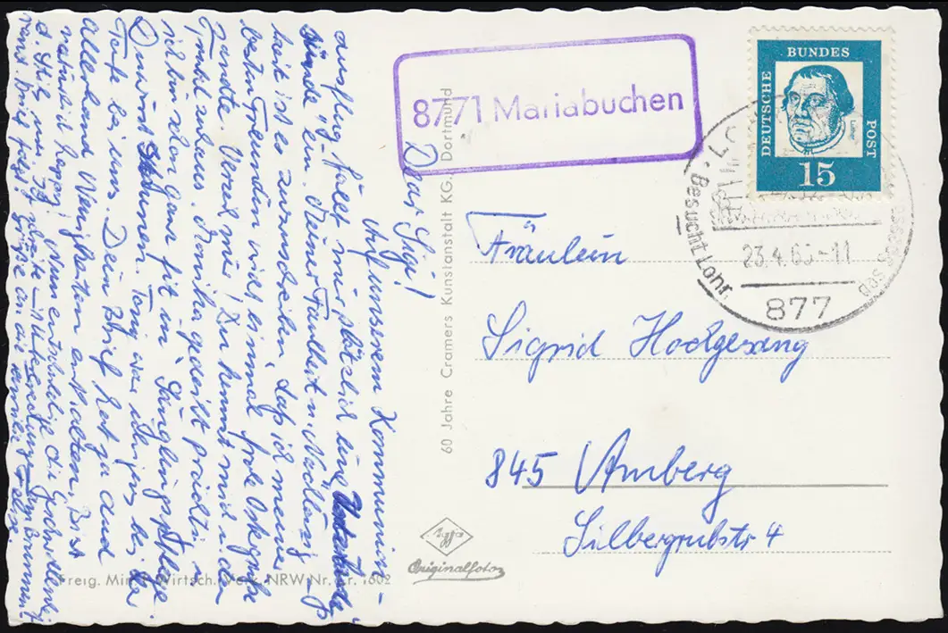 Carte de vue Vue aérienne de Mariabuchen près de Lohr, cachet spécial "877 LOHR a. MAIN Visite Lör das Spessarttor" Vérification: original Référence de l'article: 00000000030319>Note: Cet article n'est disponible qu'une seule fois. Vous recevrez exactement l ' article représenté.
