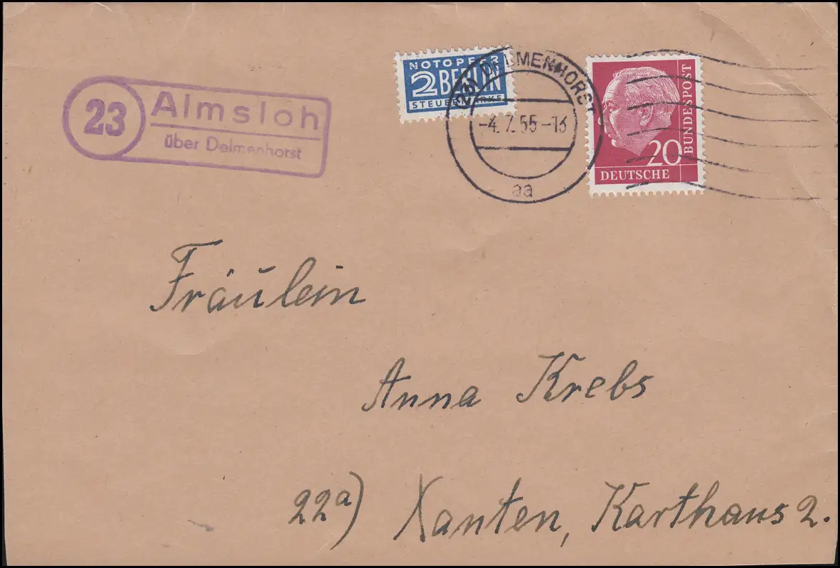 Landpost Almsloh via DELMENHORST 4.7.55 sur le recto de la lettre 185x + victimes de secours