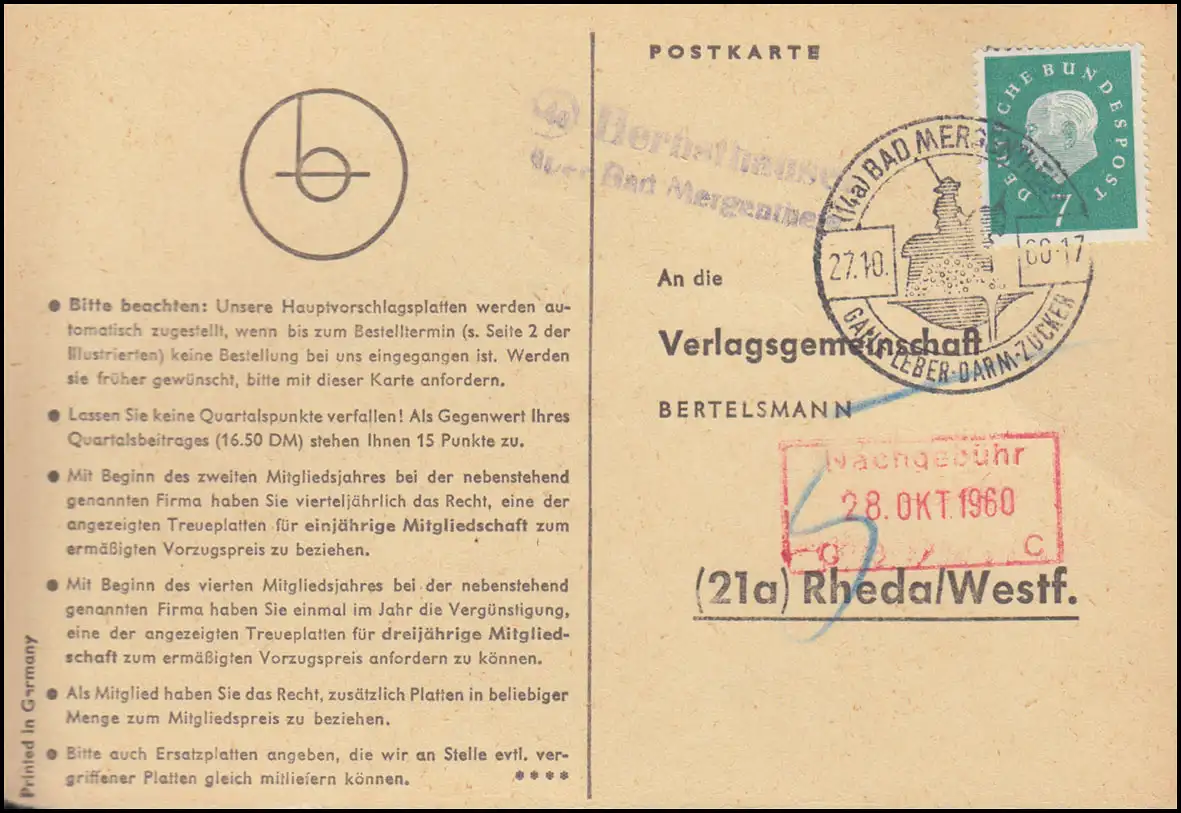 Landpost Automne via BAD MERGENTHEIM Carte postale avec SSt 27.10.60 à Rheda
