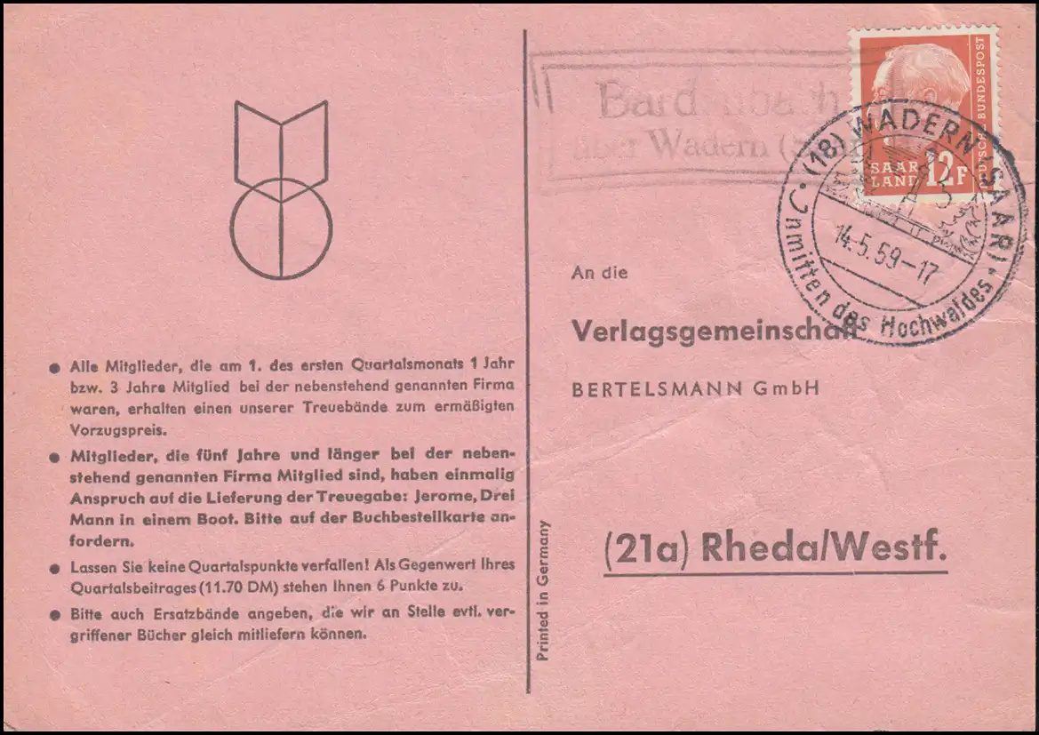 Landpost Bardenbach via Wadern (Saar), carte postale SSt WADERN 14.5.59 vers Rheda