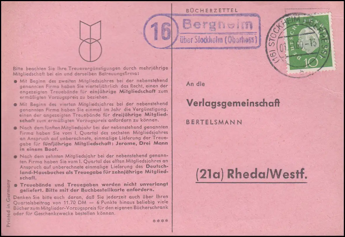 Landpost Bergheim via STOCKHEIM (OBERHESSEN) 1.11.1960 sur carte postale après Rheda