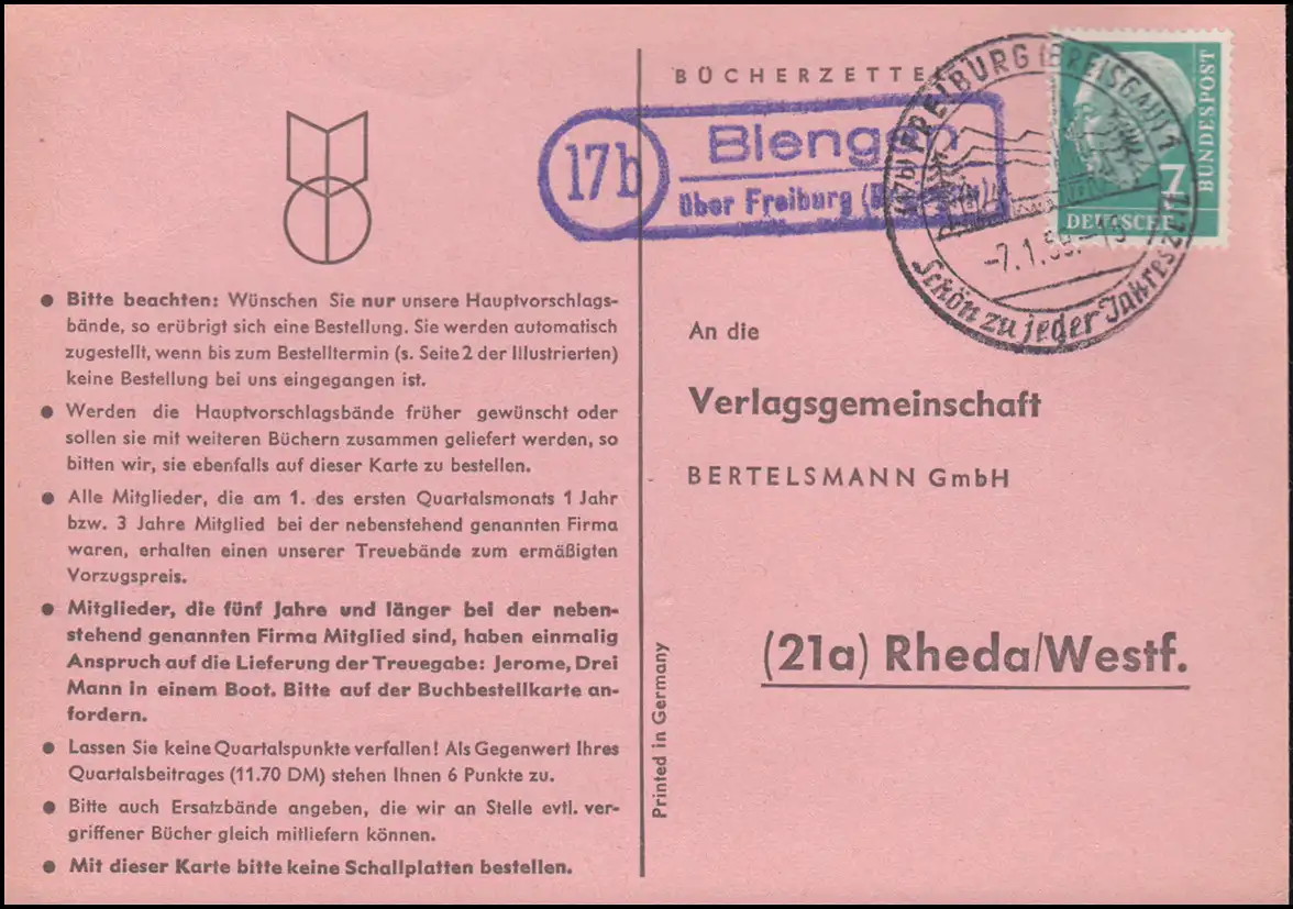 Landpost Biengen sur Fribourg (Breisgau) sur carte postale FREIBURG 7.1.1959
