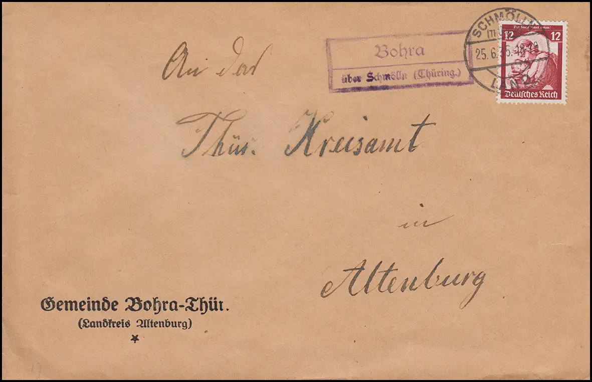 Landpost Bohra sur SCHMÖLLN (THÜR.) 25.6.35 avec 567 Lettre de la municipalité n. Altenburg