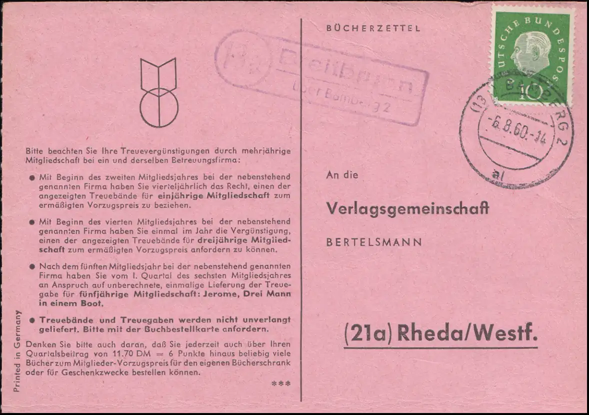 Landpost Breitbrunn sur BAMBERG 6.8.1960 sur carte postale vers Rheda