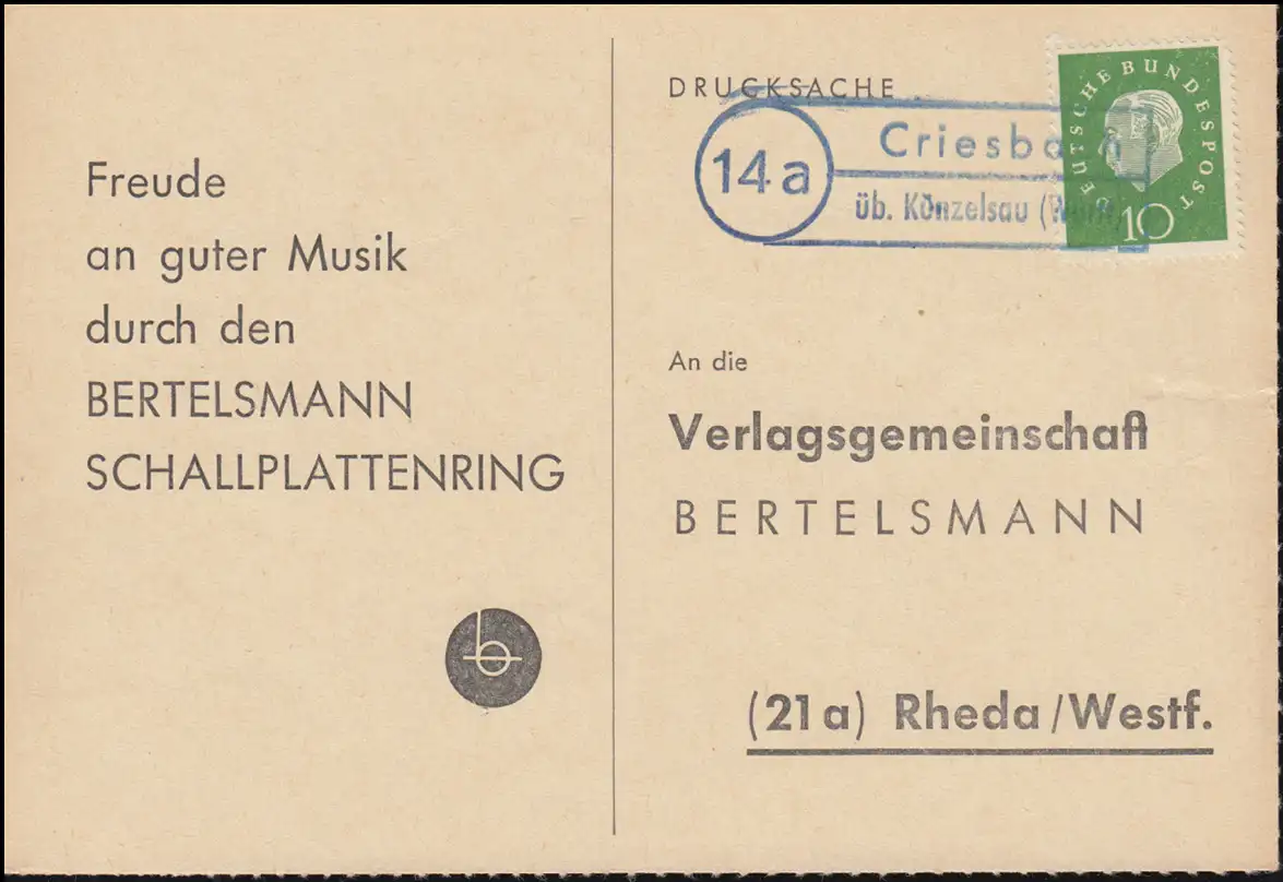 Landpost Criesbach via Künzelsau - sans cachet journalier sur carte postale selon Rheda