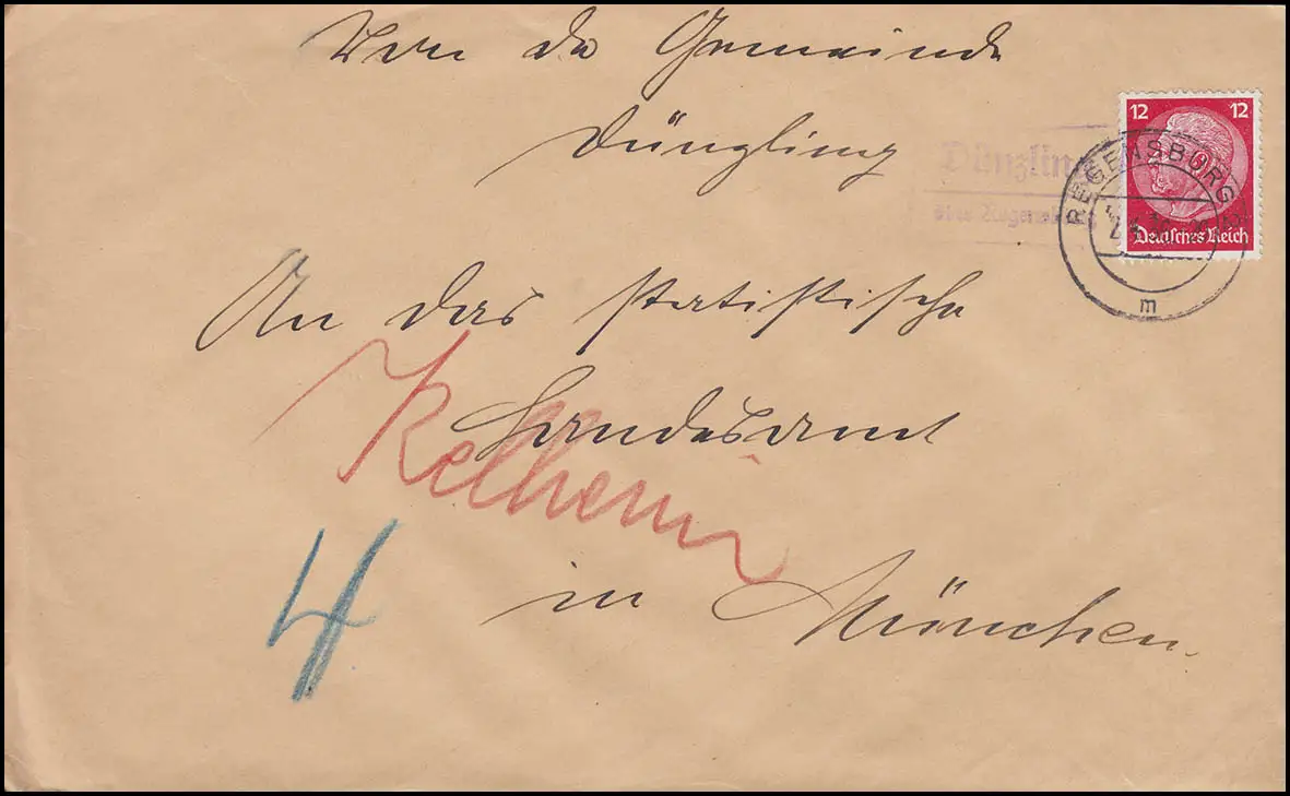 Landpost DÜNZLING sur REGENSBURG 2.4.1936 sur lettre à Stat. Landesamt MÜNNEN