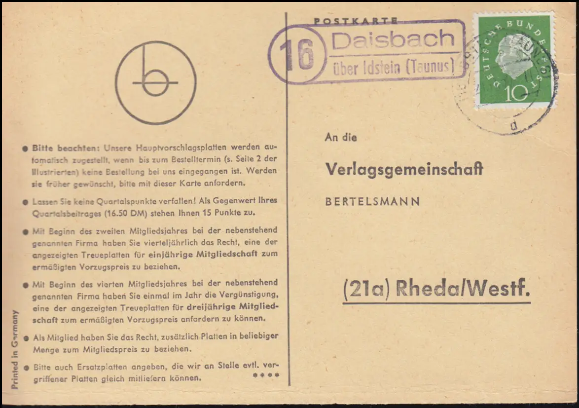 Landpost Daisbach via IDSTEIN (TAUNUS) 11.11.1960 sur carte postale après Rheda