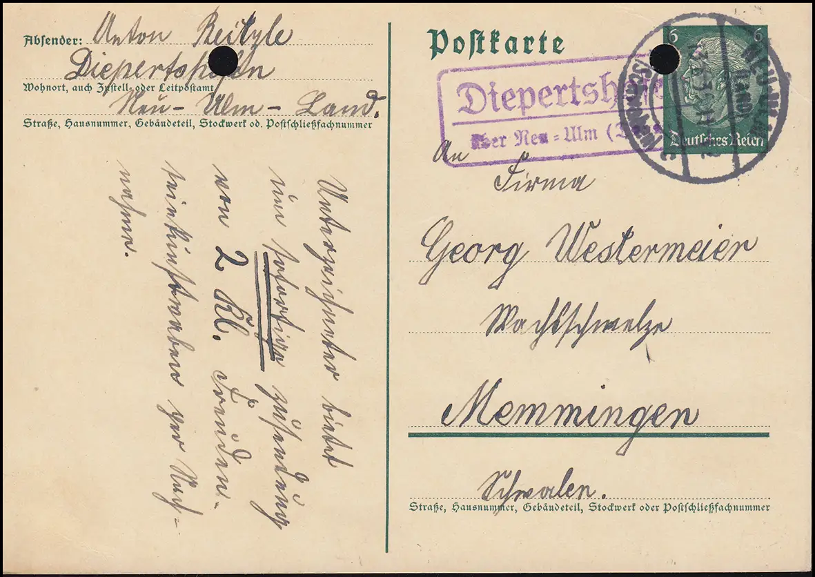 Pays-Bas: Diepertshofen via NEU-ULM (LAND) 13.6.1935 sur carte postale P 226I