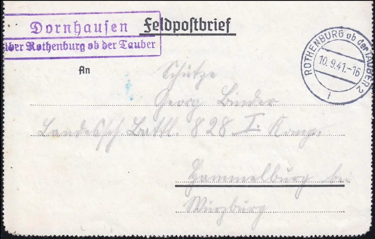 Landpost Dornhausen sur ROTHENBURG si le Tauber 10.9.41 sur lettre de champ