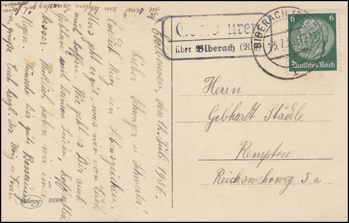 Pays-post Edelbeuren au sujet de Biberach (Riss) 13.7.36 sur les roses de fleurs AK