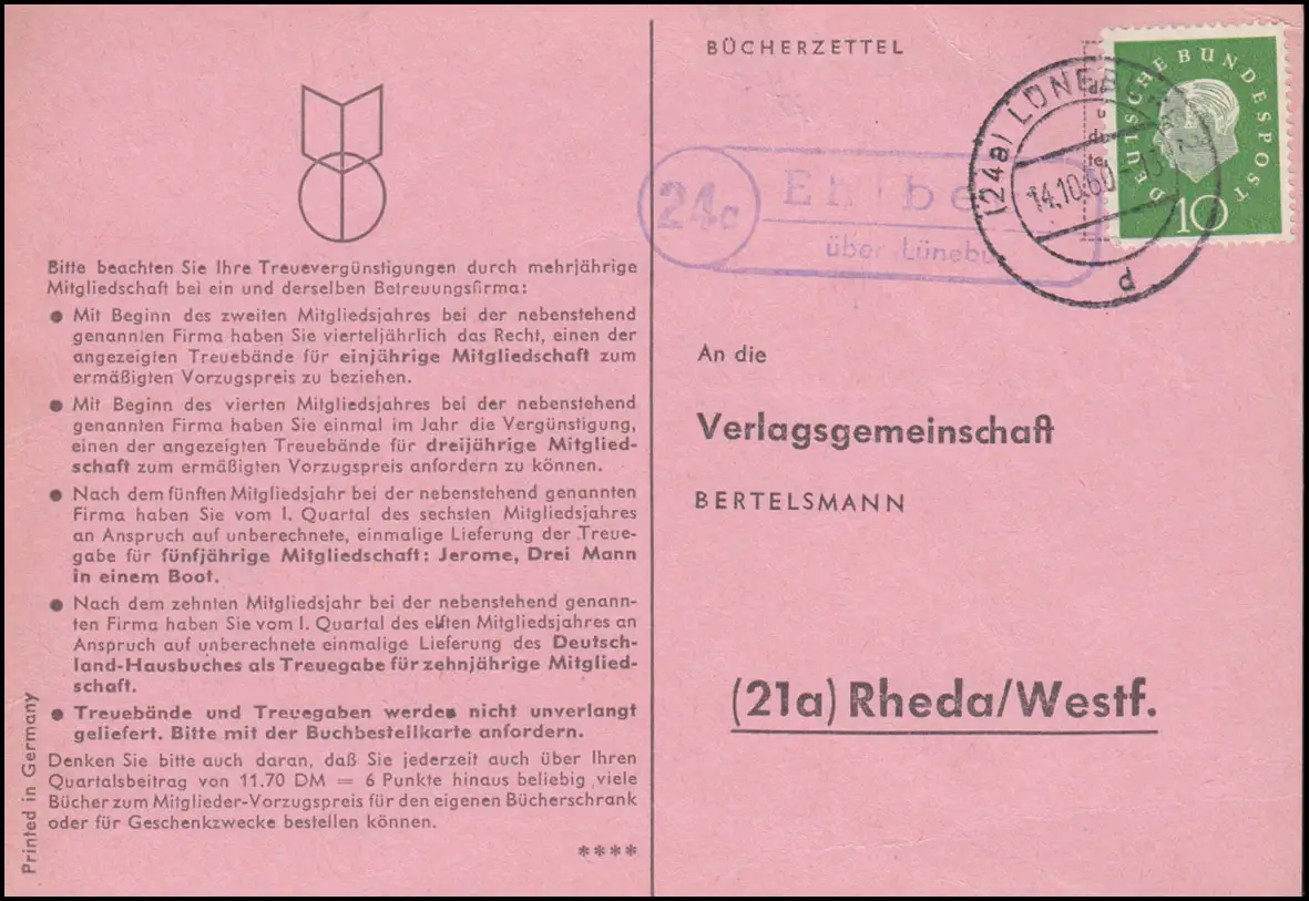 Landpost Ehlbeck sur LÜNEBURG 14.10.1960 sur carte postale à Rheda/Westf.