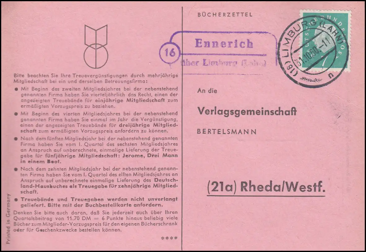 Landpost Ennerich via LIMBURG (LAHN) 31.01.1960 sur carte postale vers Rheda/Westf.