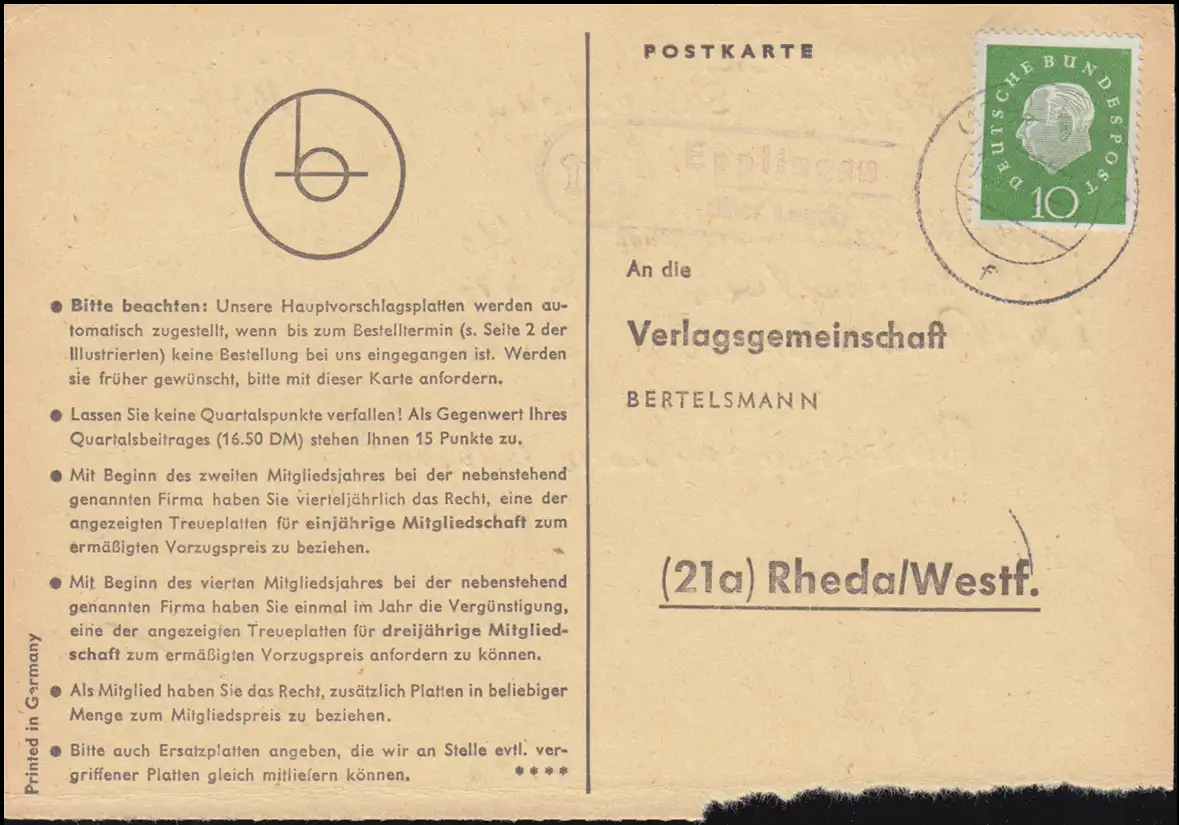 Landpost Epplingen sur LAUDA 15.10.1960 sur les livres de Rheda/Westf.