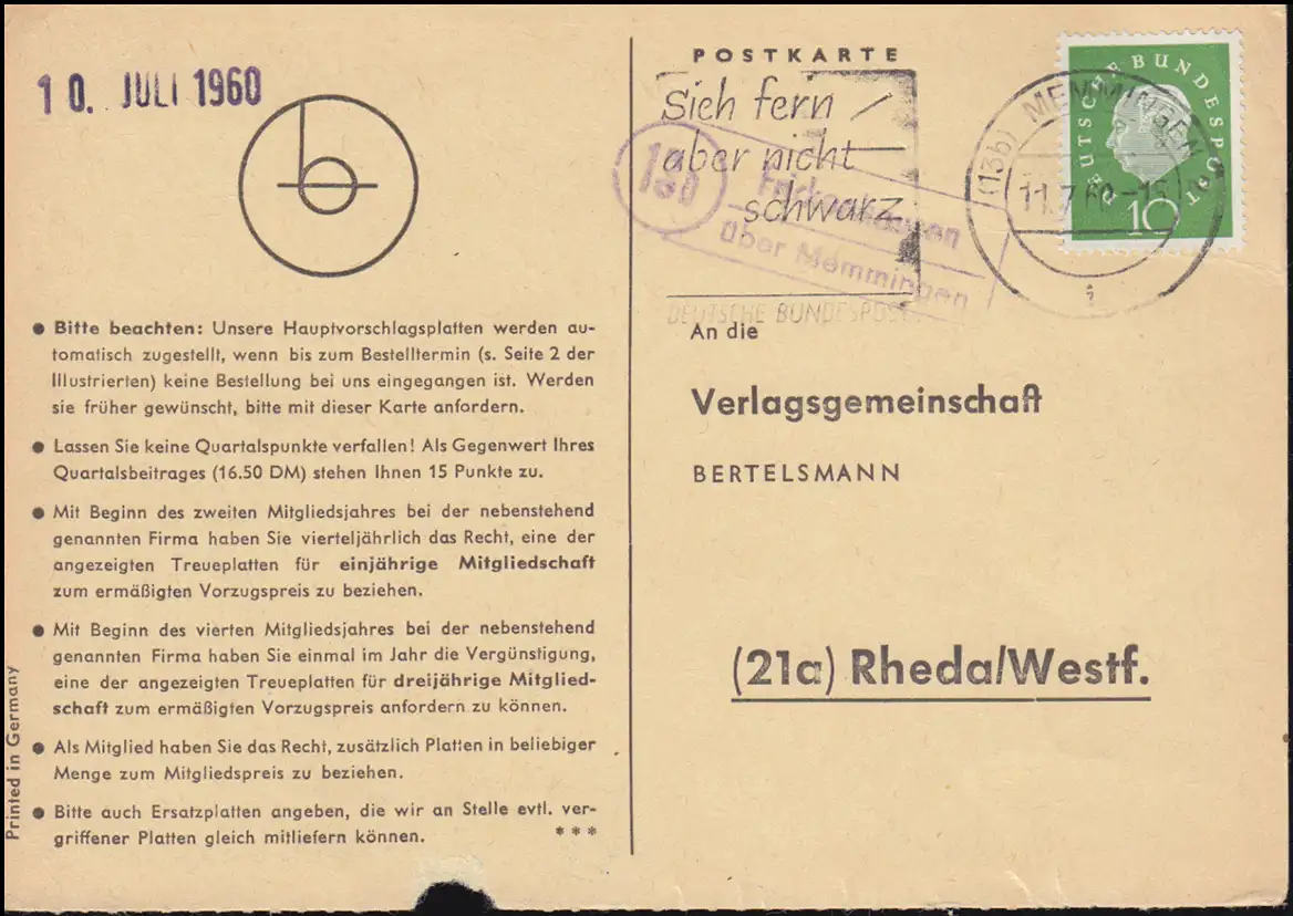 Landpost Frickenhausen via MEMMINGEN 11.7.1960 sur carte postale vers Rheda/Westf.