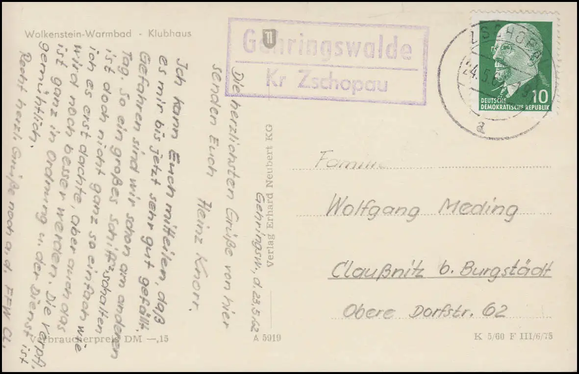 Landpost GEHRINGSWALDE Kr. ZSCHOPAU 24.5.62 sur AK WOLKENSTEIN WARMBAD Klubhaus