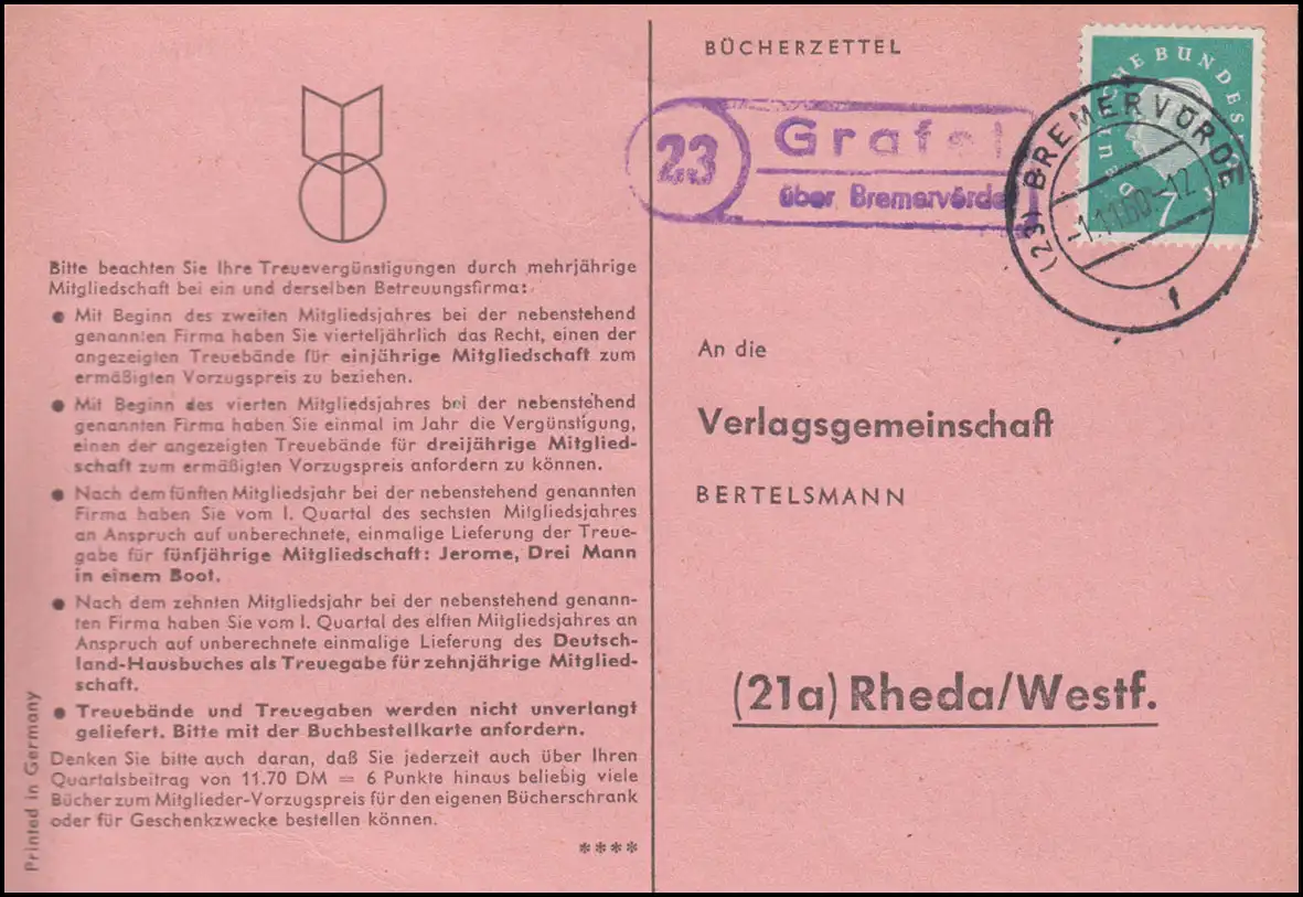 Landpost Grafel sur BREMERVÖRDE 1.11.1960 sur carte postale vers Rheda