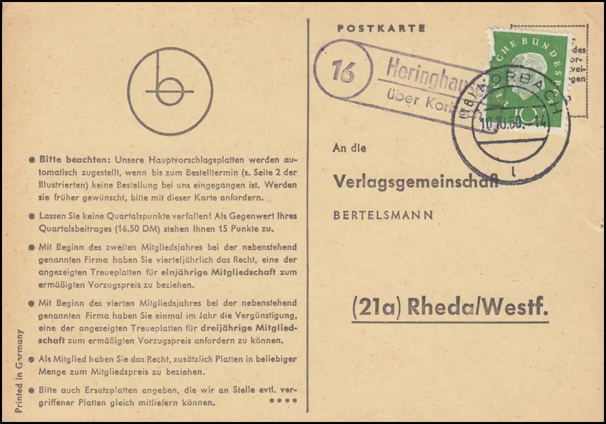 Landpost Heringhausen via KORBACH 10.10.1960 sur carte postale vers Rheda