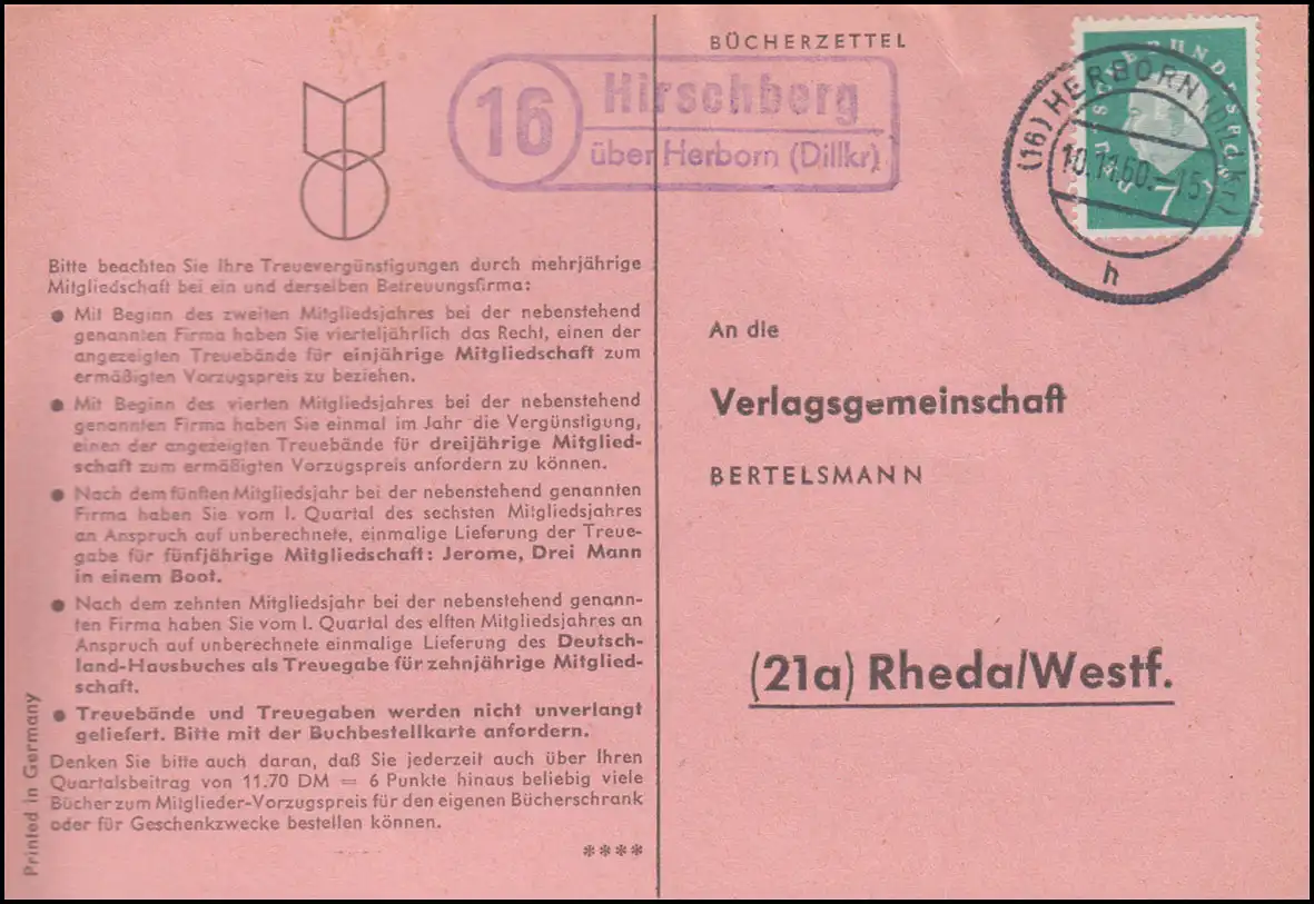 Landpost Hirschberg via HERBORN (DILLKr.) 10.11.1960 sur carte postale vers Rheda