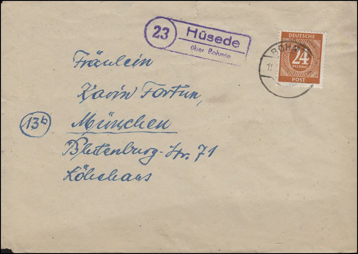 Landpost Hüsede sur BOHMTE 11.2.1947 avec 925 chiffre comme lettre EF à Munich