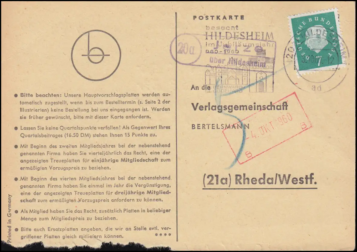 Landpost Jeze sur HILDESHEIM 3.10.1960 sur carte postale vers Rheda/Westf.