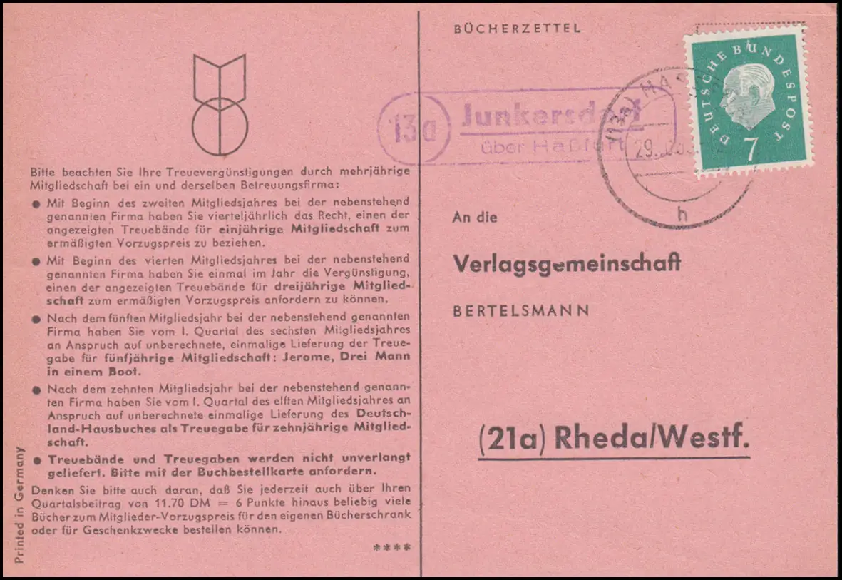 Landpost Junkersdorf via HASSFURT 29.10.1960 sur carte postale vers Rheda/Westf.