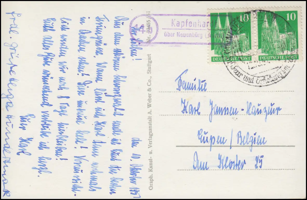 Landpost Kapfenhardt via NOUVEAUX BUREAUX 12.10.1951 avec SSt sur AK Leuchtertanne