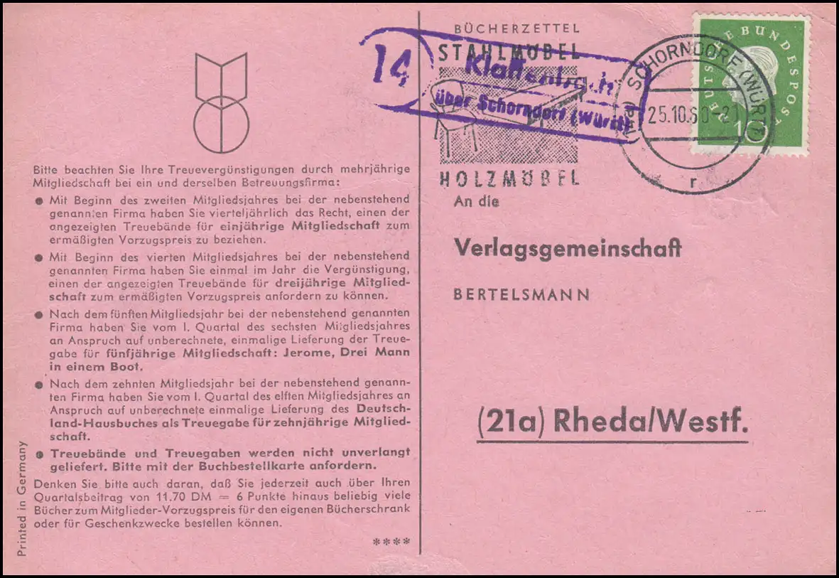 Landpost Klaffenbach via SCHORNDORF 25.10.1960 sur carte postale vers Rheda/Westf