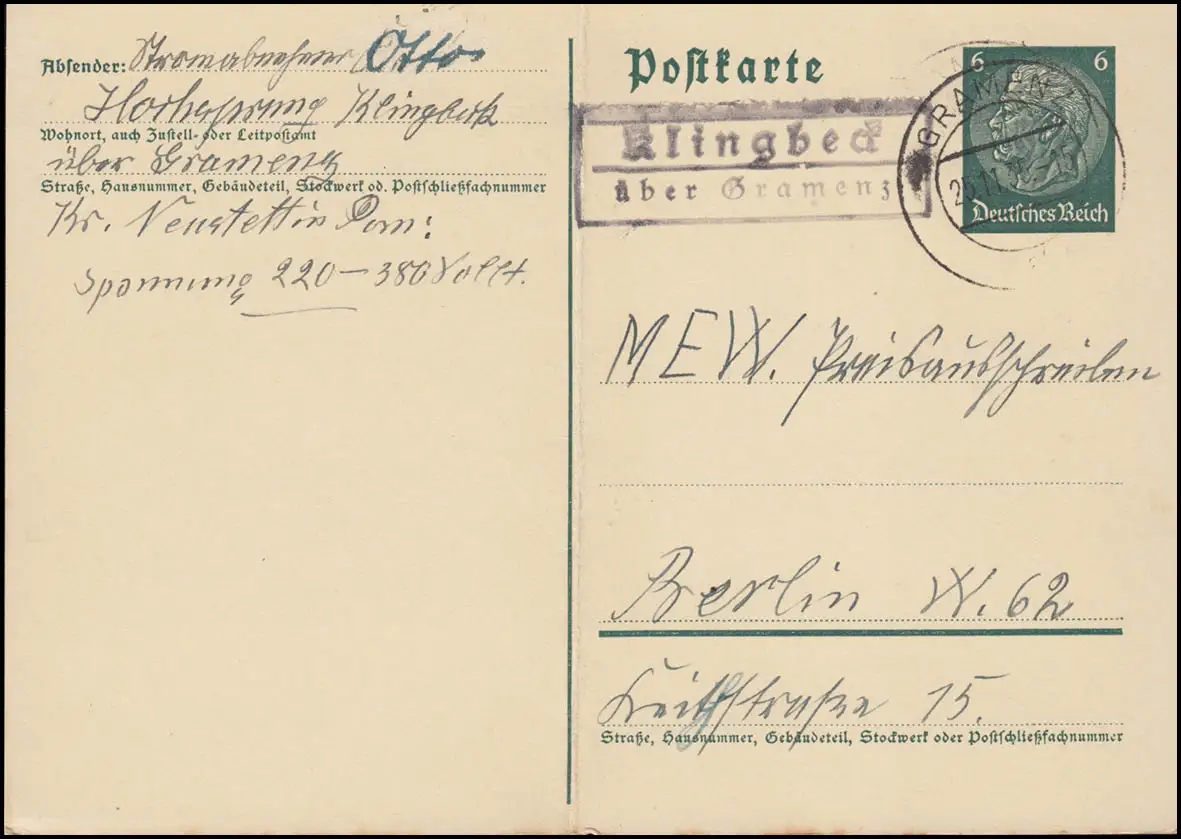 Landpost Klingbeck via GRAMENZ 25.11.35 sur carte postale pour Berlin