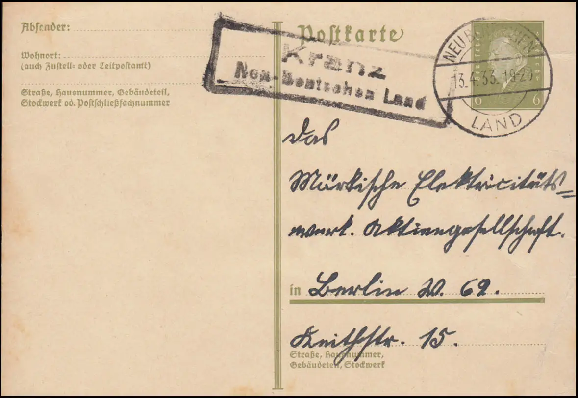 Landpost Kranz - NOUVEAU BENSCHEN LAND 13.4.1933 sur carte postale vers Berlin