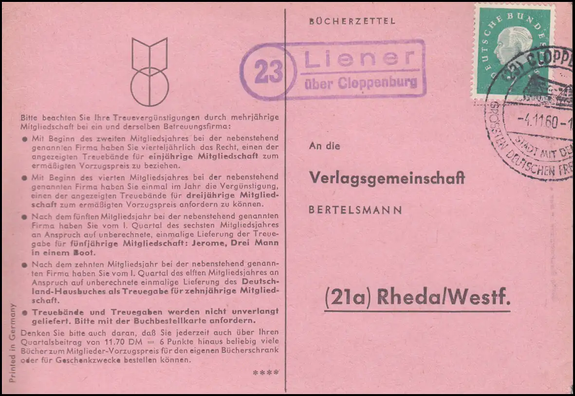 Landpost Liener via Clopenburg sur carte postale SSt CLOPPENBURG 4.11.60 vers Rheda