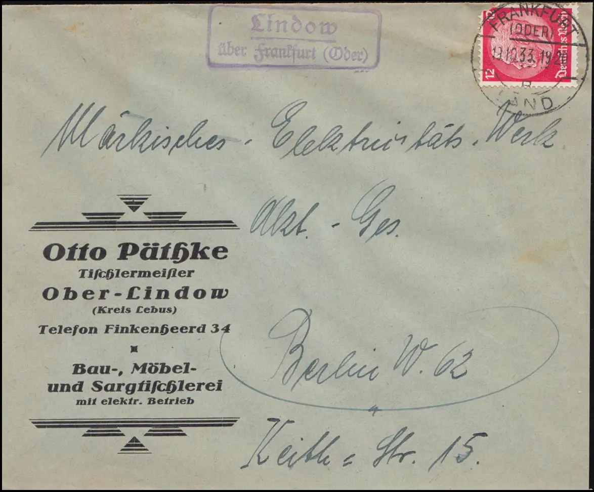 Landpost Lindow sur FRANKFURT (ODER) LAND 19.10.1933 sur lettre à Berlin