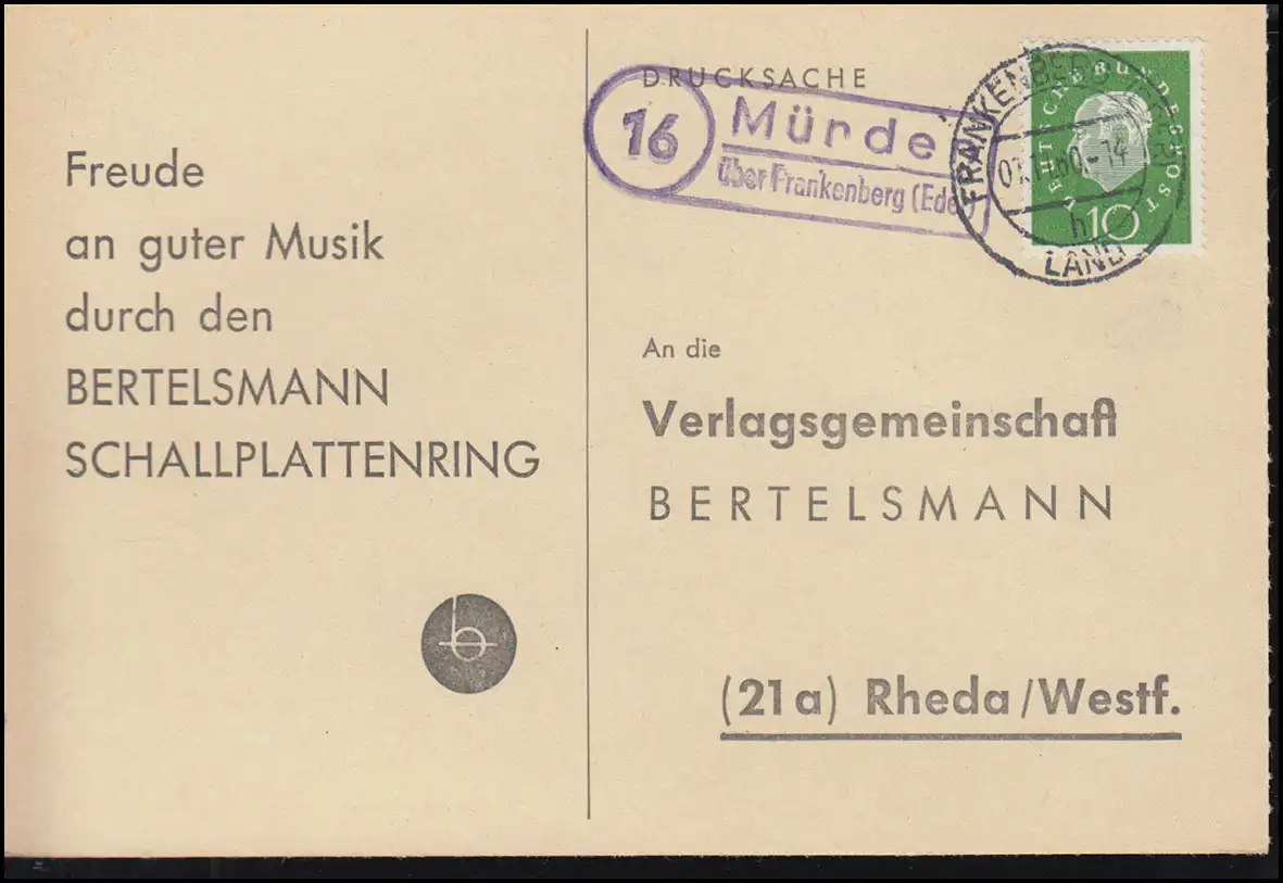 Landpost Münden sur FRANKENBERG (ESTER) PAYS 1.11.1960 sur carte postale vers Rheda