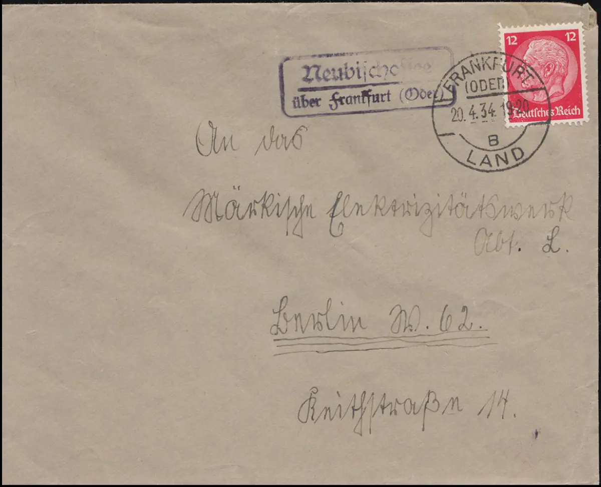 Landpost Neubischofsee (heute Polen) über Frankfurt Oder 20.4.1934