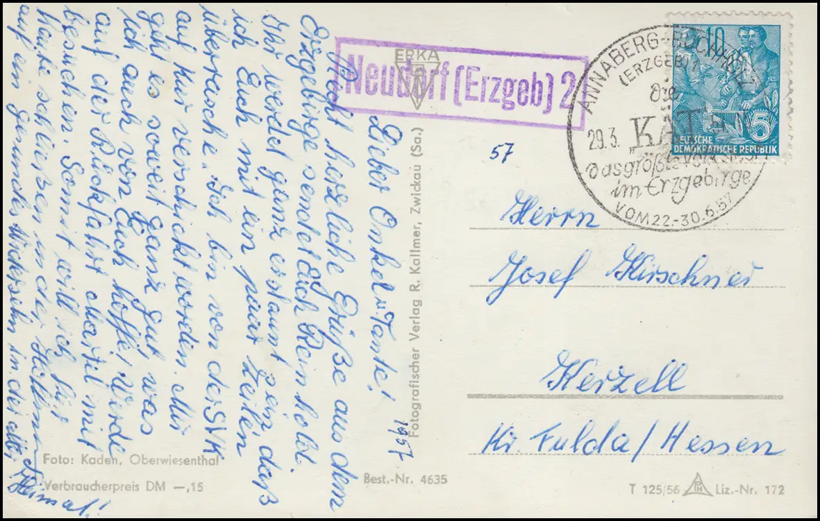 Landpost Neudorf (Erzgebirge) sur AK avec SSt ANNABERG-LÜKHOLZ KAT 29.3.1957