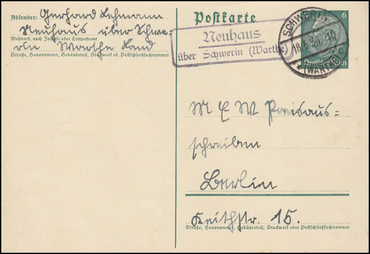 Landpost Neuhaus sur SCHWERIN (WARTHE) 18.5.1936 sur carte postale à Berlin