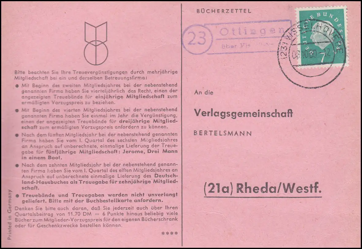 Landpost Ottingen via VISSELROVEDE 8.10.1960 sur carte postale vers Rheda/Westf.