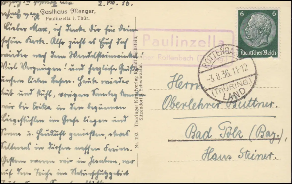 Le courrier de campagne Paulinzella sur ROTHENBACH (THURINGEN) 3.8.1936 sur AK approprié