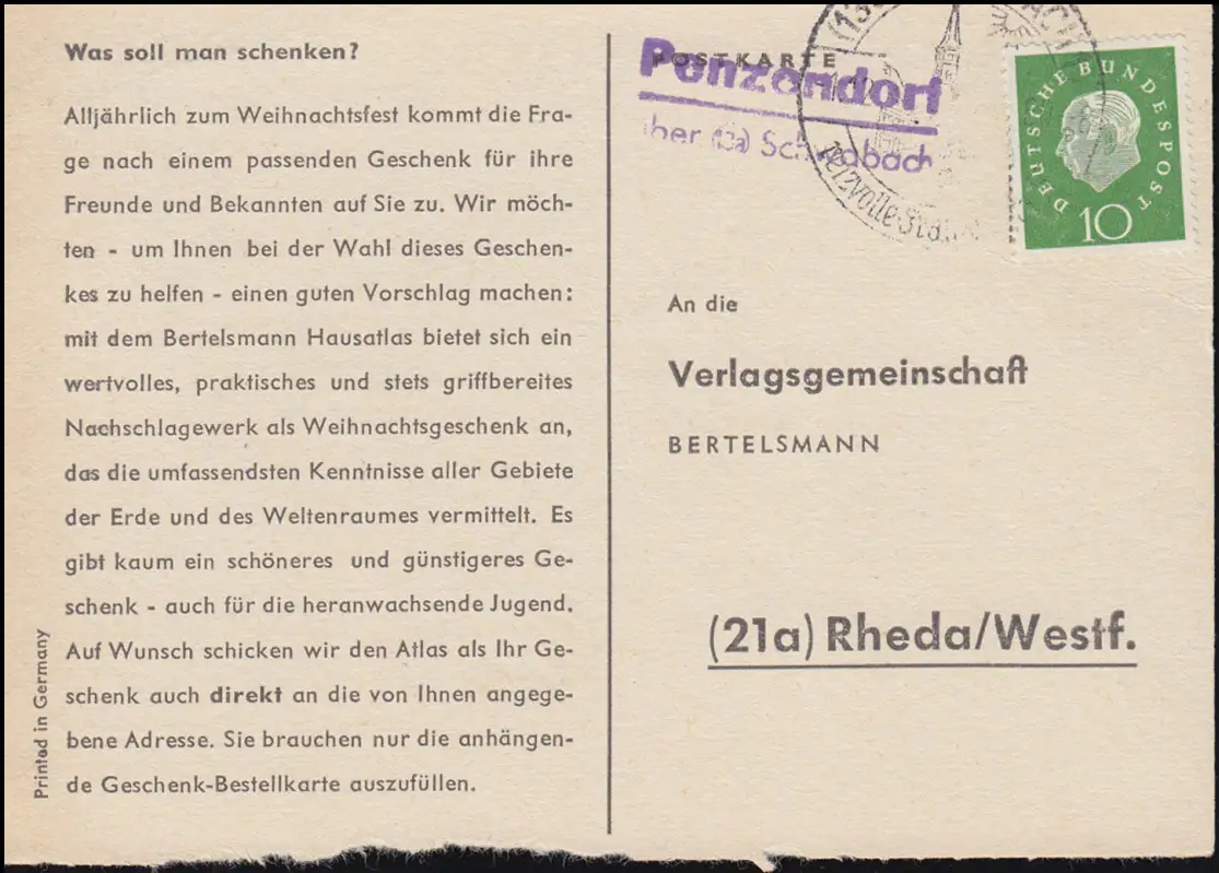 Landpost Penzendorf via SCHWABACH, carte postale SSTH SCHHABACCH 1.12.1960 vers Rheda